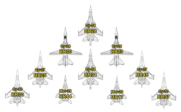 ВПГ "Беркуты" представит "Липецкое тактическое крыло", состоящее из десяти самолетов различных типов: Су-27, Су-30, Су-24, Су-34, МиГ-29 и демонстрирующее состав сверхзвуковой тактической авиации России.