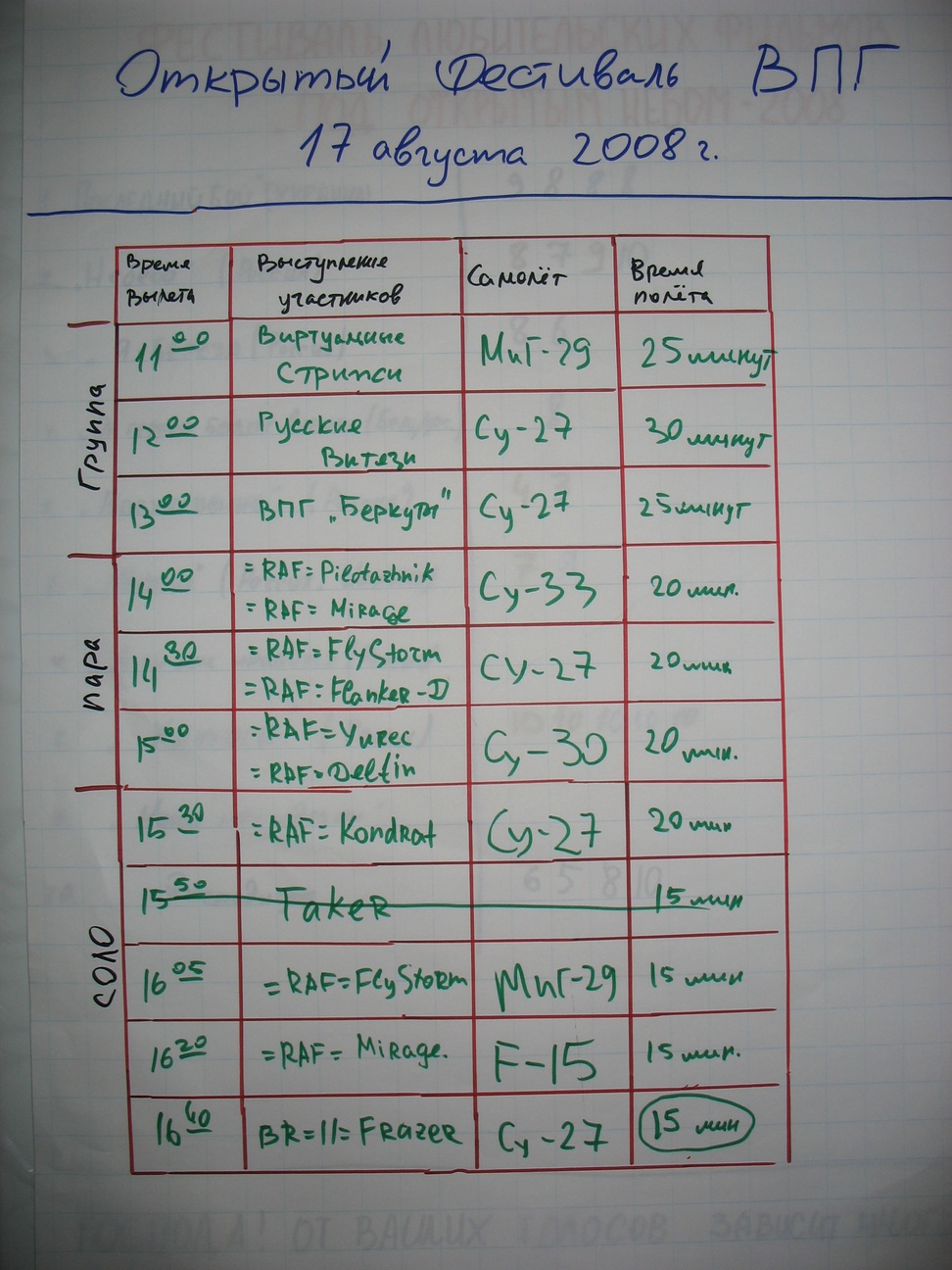 Мы подавали заявку на выступление группой из четырех Су-27. Для выступления был выбран адаптированный вариант программы для шести самолетов. Состав демонстрационного звена: