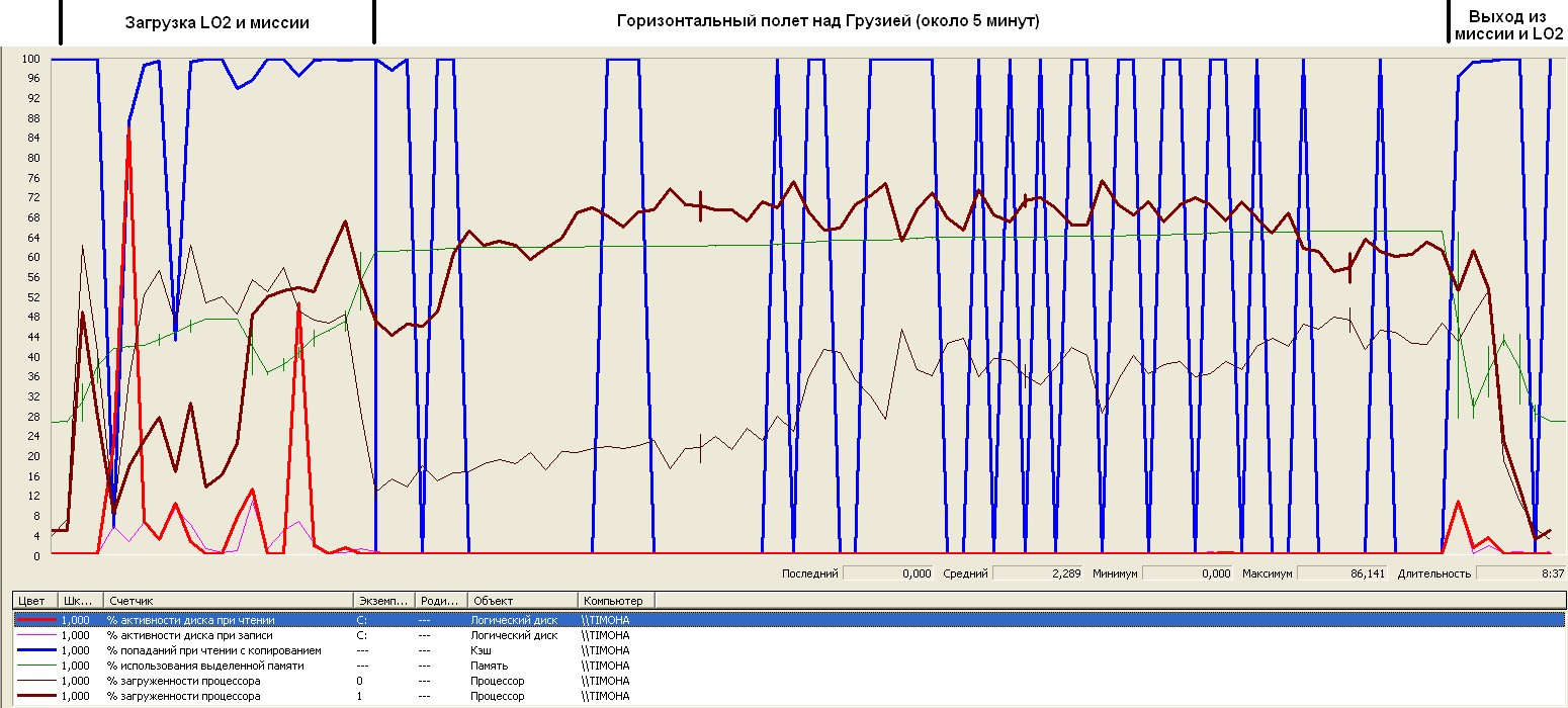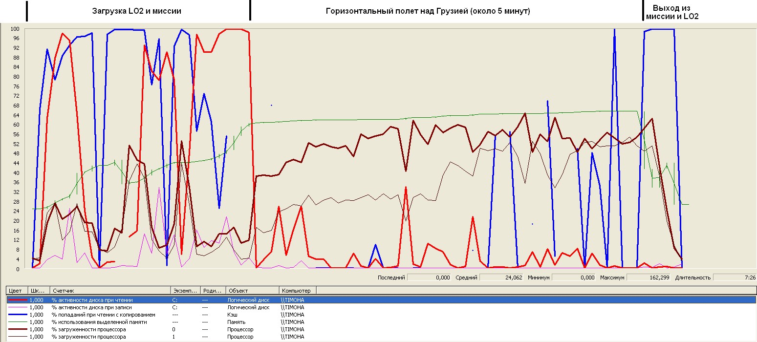Сразу скажу, что причину фризов у Тимура мы нашли. Для этого пришлось включить журналирование производительности, собрать, а потом изучить порядка пятидесяти параметров работы компьютера во время полетов в LO2. Конечно, интересно посмотреть своими глазами, поэтому изучаем графики, на которых отображены только ключевые для понимания параметры.